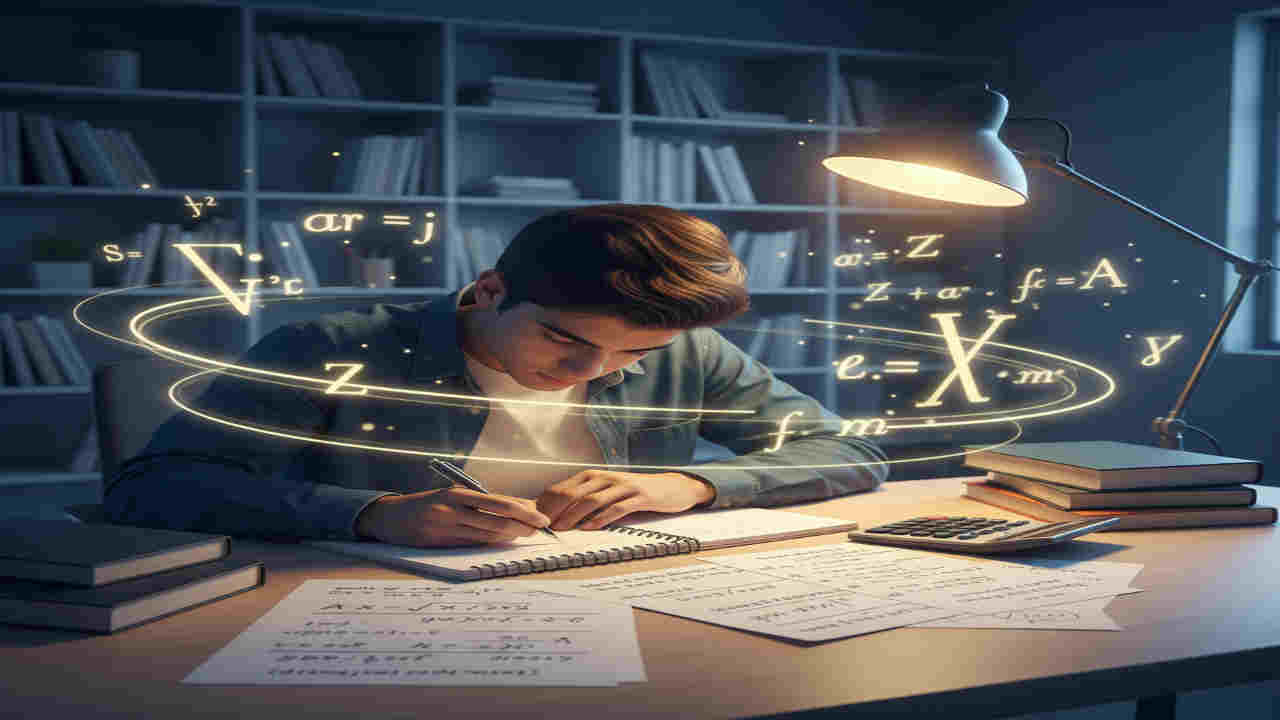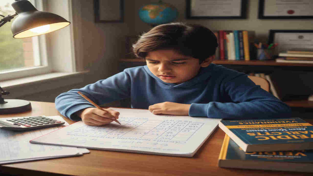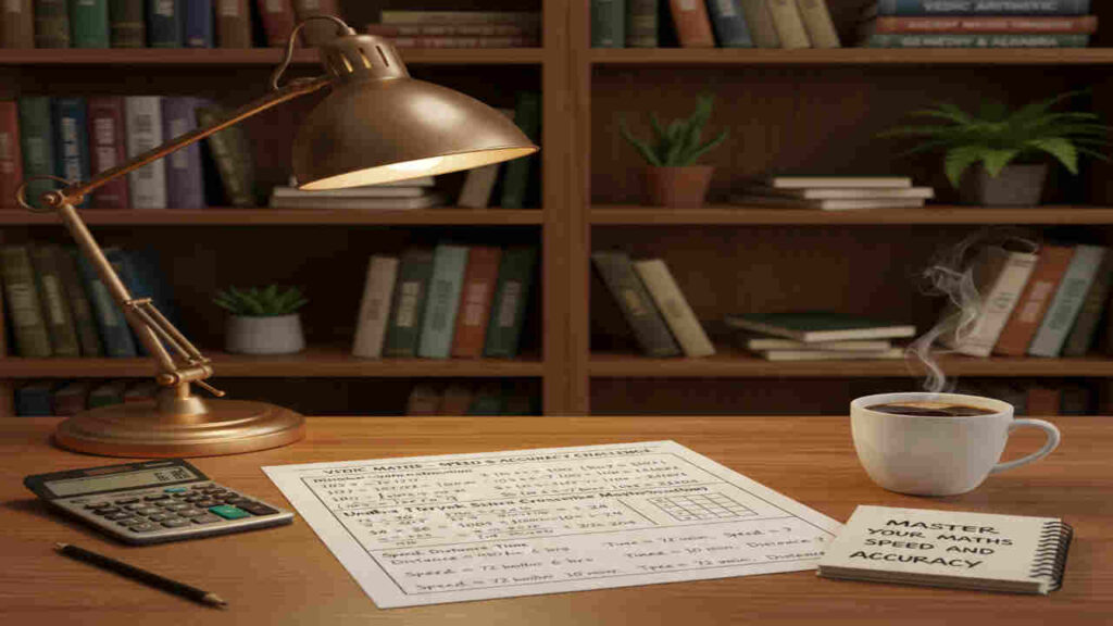Image Prompt: Create an image of a study desk with a Vedic Maths worksheet open, filled with speed calculation problems. The worksheet should include problems involving multiplication, division, and speed-time-distance calculations. Beside the worksheet, include a calculator, a pencil, and some notebooks. The background should be a cozy, well-lit study room with bookshelves and a motivational quote related to learning.